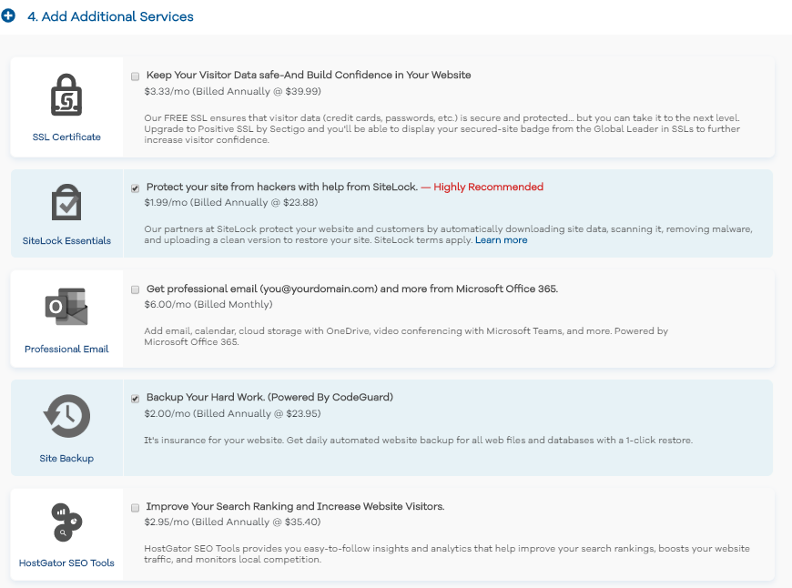 In this section, you can choose from these hosting Addons. SiteLock and Site Backup Addons are already checked in for you. If you don’t want these, then manually uncheck them.