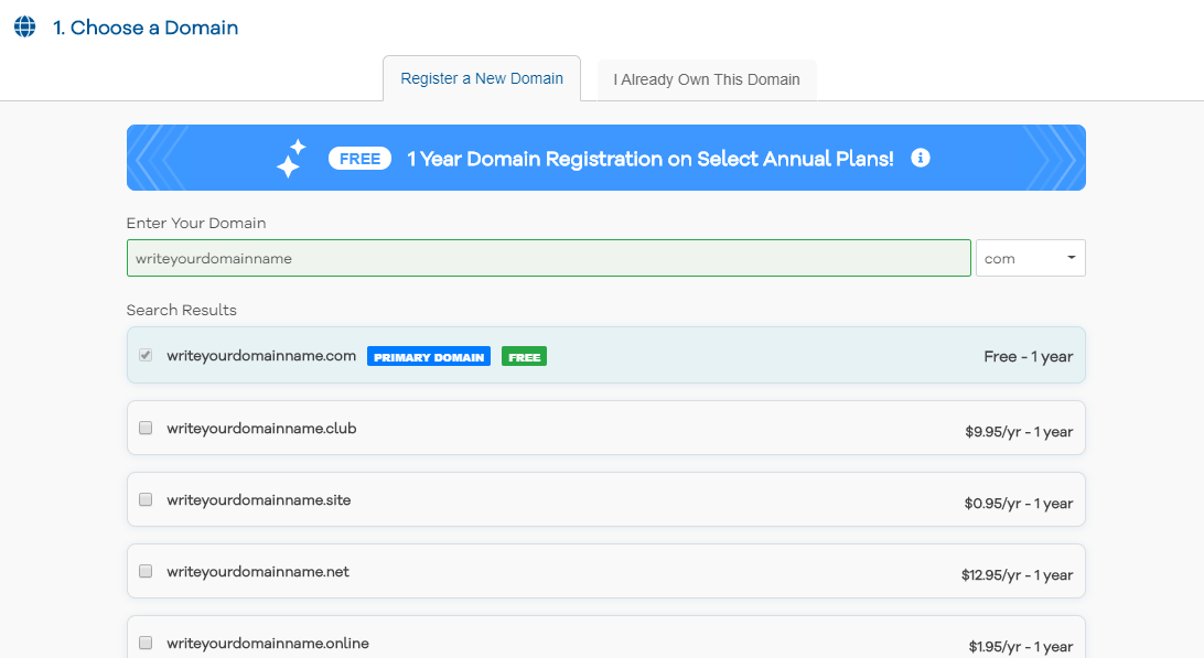 As we have already discussed Choosing a domain part in great detail in the brainstorming post, we will go ahead and put in our domain name in the given space. If your domain name is available, the box will turn green.
